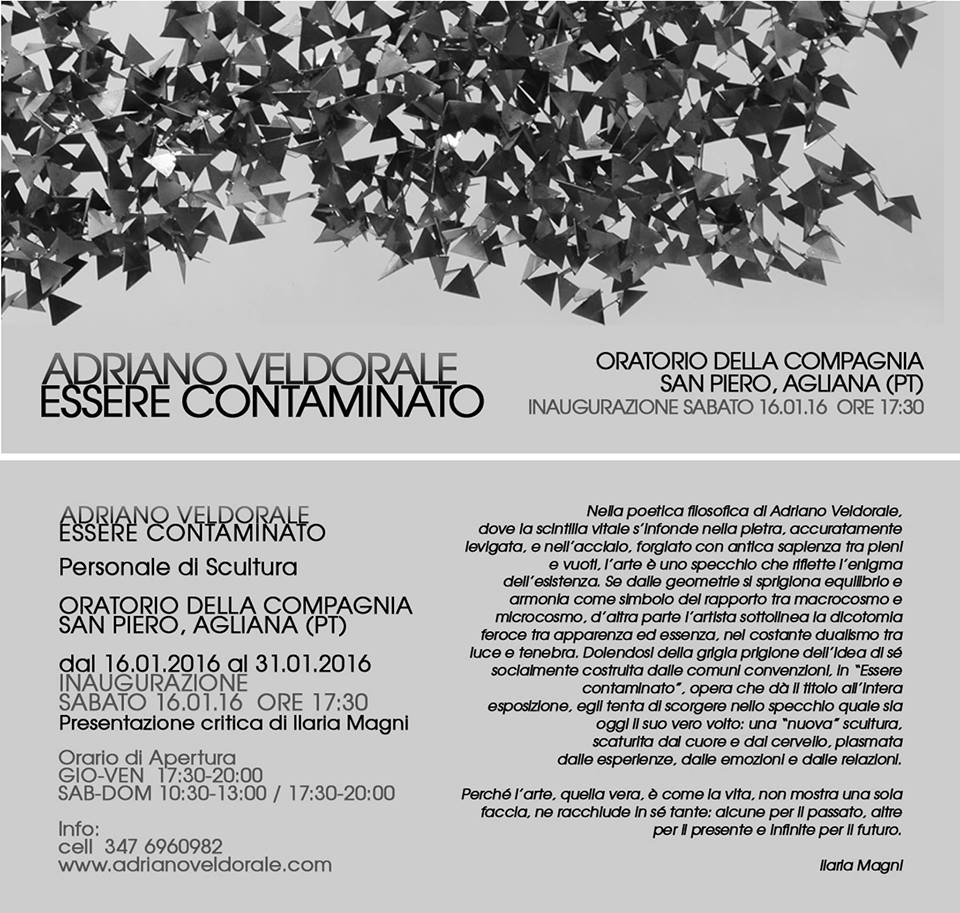 L’esposizione è presentata da Ilaria Magni, curatrice, storica e critica d’arte, conduttrice della trasmissione TV Art Connections. Scrive Ilaria Magni “L’artista sottolinea la dicotomia feroce tra apparenza ed essenza, nel costante dualismo tra luce e tenebra. Dolendosi della grigia prigione dell’idea di sé socialmente costruita dalle comuni convenzioni, in Essere contaminato, opera che dà il titolo all’intera esposizione, egli tenta di scorgere nello specchio quale sia oggi il suo vero volto: una “nuova” scultura, scaturita dal cuore e dal cervello, plasmata dalle esperienze, delle emozioni e delle relazioni. Perché l’arte, quella vera, è come la vita, non mostra una sola faccia, ne racchiude in sé tante: alcune per il passato, altre per il presente e infinite per il futuro”.