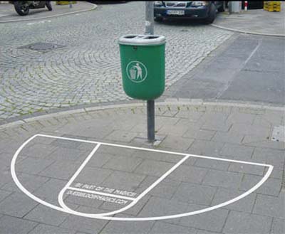 Per pubblicizzare la squadra di basket di Dusseldorf, nei cestini del centro si รจ ricorso ad una particolare segnaletica stradale! Fuori area "pedonale" vale tre punti! Io uscirei di casa pur di andare a buttare la carta li! :)