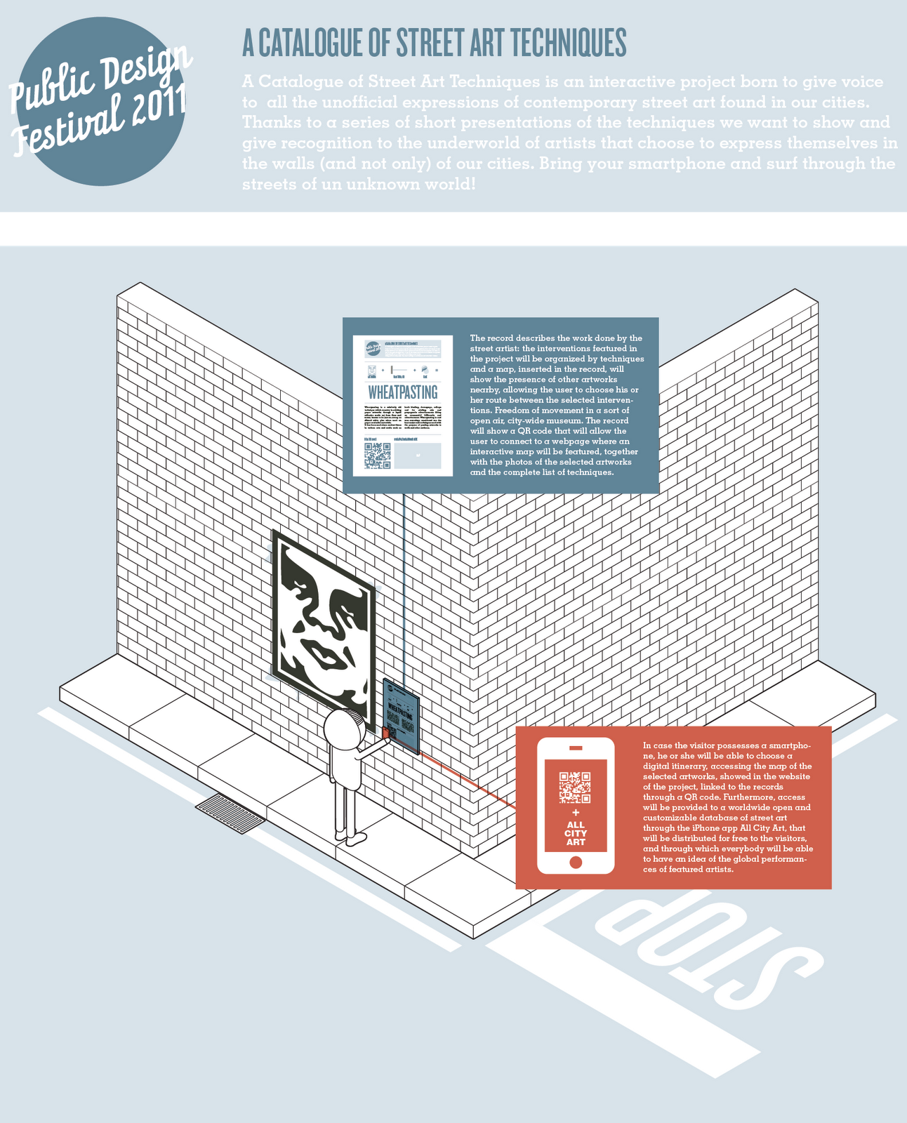 In the attempt to involve citizens in the experience of an interactive, open air art museum, spread to the whole urban pattern of the city, A Catalogue of Street Art Techniques does not want to create anything new, but rather to give value to what is already present".