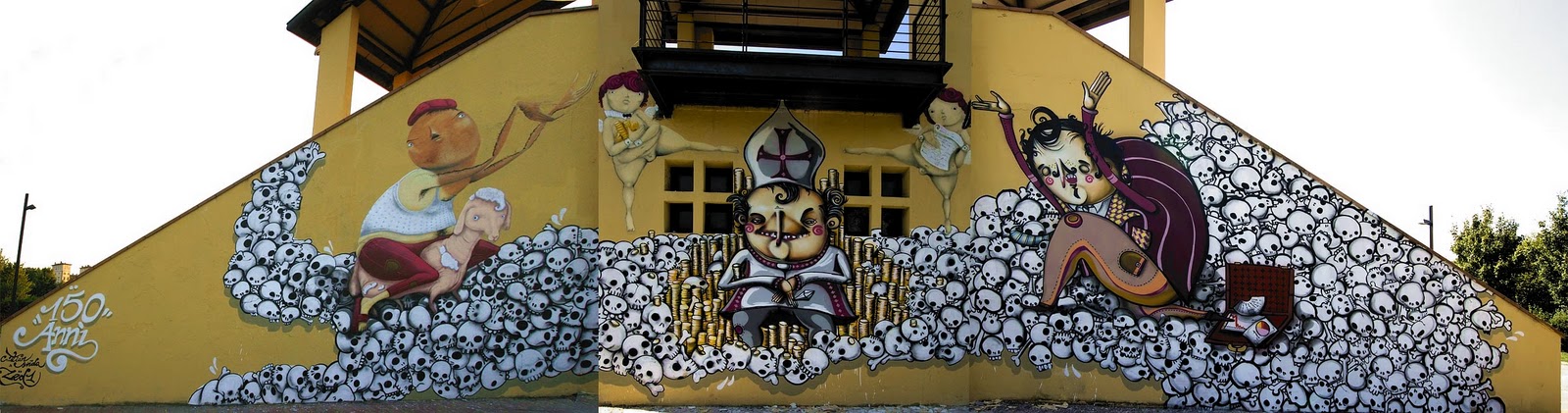 CHRISTIAN SONDA + MARCO ZED Autore Lun, 26/09/2011 - 21:33 | Dario Ujetto 150 ANNI DELL'UNITA' D'ITALIA Cristian Sonda + Marco Zed 1 Wallpainting murales realizzato da Cristian Sonda e Marco Zed nel 2011 a Montelupo Fiorentino ( Firenze ). L'opera e' un'omaggio sarcastico al 150esimo della Repubblica italiana.