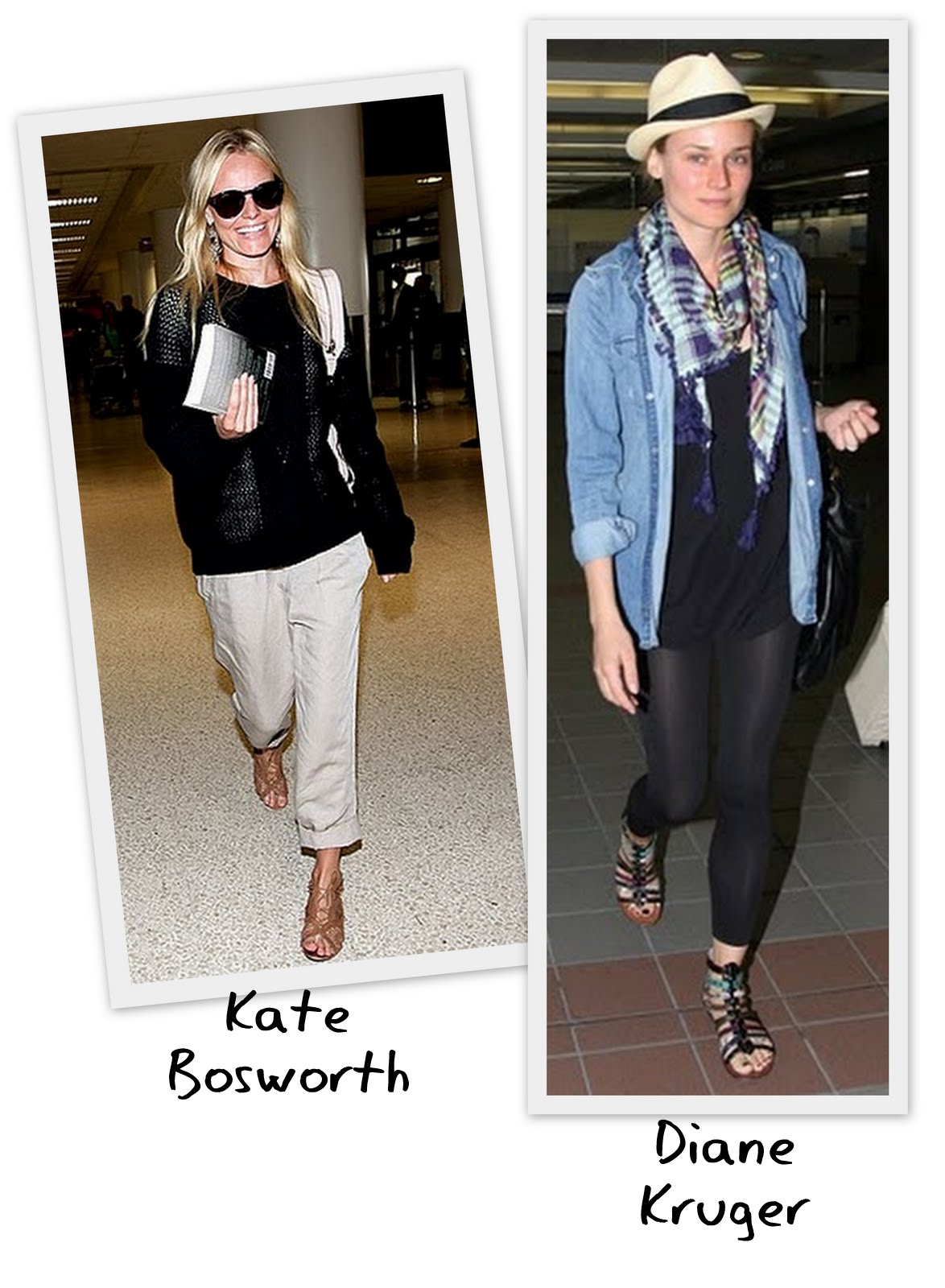 Sandali, mocassini o ballerine ed una sciarpa, per proteggersi dall'aria condizionata. Magari anche un cappello, come suggerito da Diane Kruger, se in valigia non c'è posto. E poi gli immancabili occhiali da sole, per mascherare i segni della stanchezza.