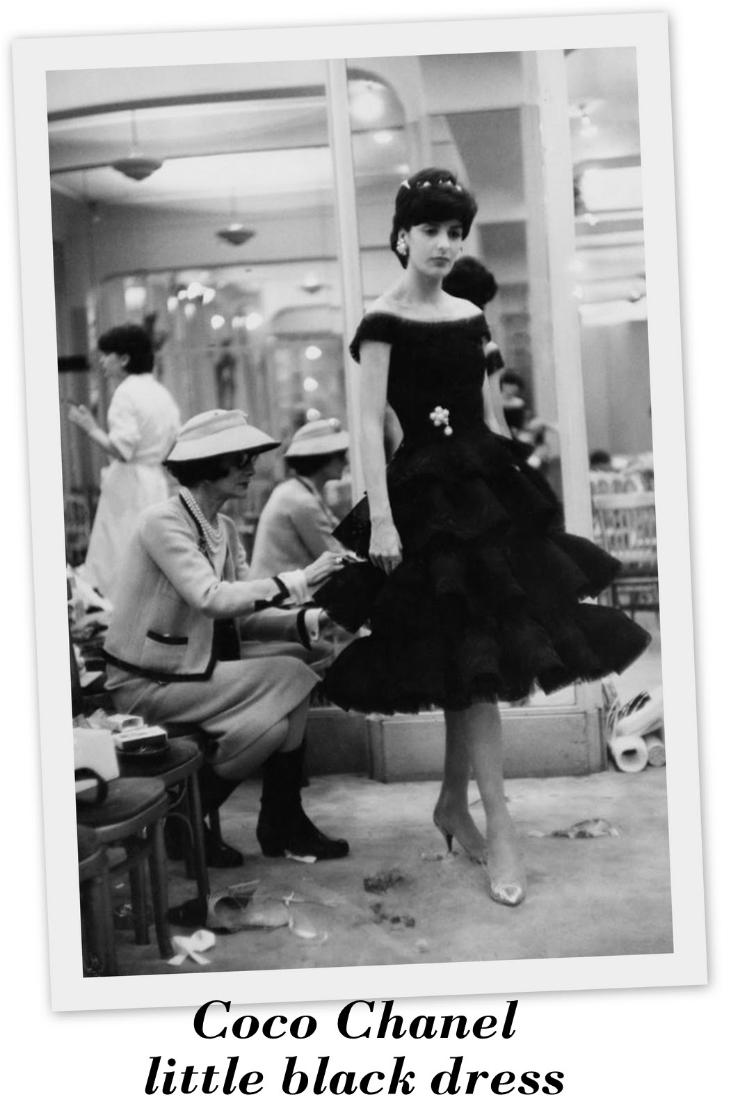 Chanel is said to have invented the LBD, because during the war women needed dresses that didn't require maids help to be worn, which in hard times, were costly and few could afford. She used to style it with a camellia and a string of pearls.