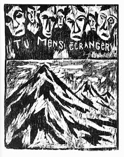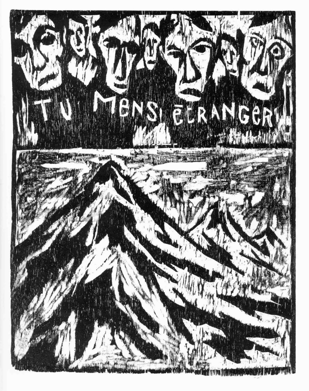 Il lavoro compiuto da Deprez sul Castello è invece viscerale ed espressionistico fin dall'inizio; dall'ideazione all'esecuzione l'artista corrode la materia di cui sono composti i personaggi e le scene della (in)azione: i volti, i corpi, le campane, i ponti, le montagne, tutto sembra scavato nella materia pura da un demiurgo infernale, insensibile anche di fronte ai rari scorci di umanità che a fatica emergono dagli sguardi stilizzati. Talvolta si tratta di pochi, decisi colpi di scalpello, in altri luoghi sono moltitudini di segni e schegge a ferire tavole accecanti di cupa disperazione. La tecnica xilografica crea forme nette ma in perenne mutazione, combattute fra luce ed ombra, fra pensiero e resistenza della materia. L'inconciliabilità fra gli opposti fa sì che l'immagine rifiuti la forma ed è, in fondo, una questione puramente linguistica. E' un problema di linguaggio, infatti, che si pone di fronte a chi vuole nominare l'indicibile, a chi vuole trarre fuori dalla materia nera, ruvida e scabrosa il senso di un'umanità al tramonto. Del resto incompiutezza ed indeterminatezza sono i caratteri, tragici, del testo kafkiano, fatto di attese e silenzi immobili quanto lancinanti, dialoghi indecifrabili, edifici e luoghi muti nella loro enigmatica presenza.