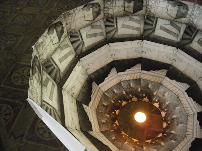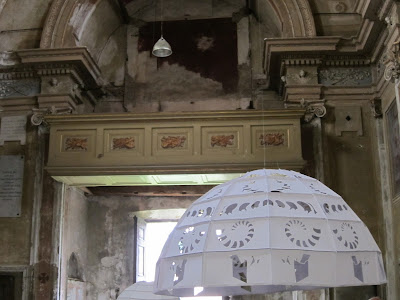 Le cupole/vasche, come attratte verso il centro della terra, riflettono la loro natura terrestre e sono state quindi realizzate da Claudia con materiali pesanti, come il ferro, e grezzi, come il cartone: rappresentano il predominio della materia sul pensiero e sull'elevazione dello spirito. Procedendo verso l’altare il diametro delle cupole poste a terra diminuisce, e così anche il loro peso, il vuoto si insinua nel pieno, si affaccia la volontà e il bisogno dell’uomo di riconoscere se stesso attraverso i luoghi, fisici e simbolici, che si trova ad attraversare durante la sua vita. L’ultima cupola rovesciata è realizzata attraverso l’assemblaggio di molteplici incisioni su carta, eseguite con tecnica ad acquaforte, su cui sono raffigurati particolari architettonici che rimandano alle esperienze dell’uomo: al pari del sommo poeta Dante, l’individuo si trova a percorrere ed affrontare le profondità e degli oscuri abissi della propria anima, per poi lentamente “uscire a rivedere le stelle”, acquisendo consapevolezza di sé attraverso la contemplazione della perfezione del Creato e delle sue Meraviglie.