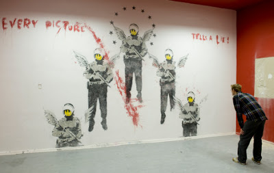 The mural, entitled Every Picture Tells a Lie, which was created by the world’s most famous street artist in 2003 as a part of the legendary Back Jumps Live Issue festival in Berlin-Kreuzberg, shows five winged and smile-faced cops and is now part of the What Lies Beneath artwork by Downey, which belongs to the currently running Do not think exhibition at the Bethanien Arts Centre.