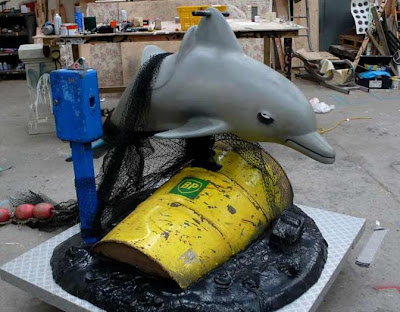 “Reconditioned dolphin ride with crude oil and tuna net”. Nuova genialata di Banksy a Brighton Pier, parco divertimenti sul mare a sud di Londra. Metti la monetina e cavalchi un delfino(impigliato in una rete per tonni) che cavalca un’onda di petrolio, con tanto di barile marchiato Bp!
