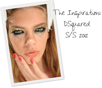 L'ispirazione per questo primo look è dalla sfilata P/E 2012 dei gemelli Dsquared, glitter e brillantini che creano uno smoky eyes altamente imperfetto. Per ricreare questo make-up, sfumate gli occhi con l'ombretto nero e matita per creare uno smoky eyes di base, poi applicate dell'ombretto oro nell'angolo interno e l'eye-liner glitter.