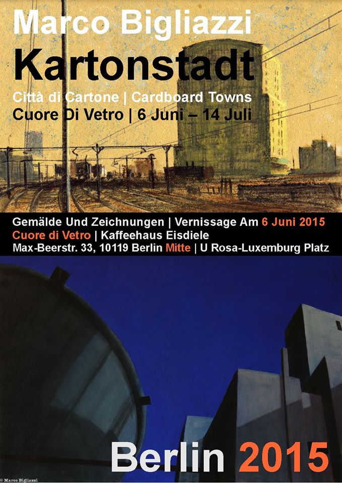 L'opera di Marco Bigliazzi dona vita alle Città di Cartone, quando protagoniste assolute del silenzio e della quiete, quando cristallizzazione di una inarrestabile concitazione urbana: la desolazione o la sovreccitazione fissate in un'atmosfera sospesa. Qui la figura umana è un'assenza: solo l'artista stesso (regista) e lo spettatore (pubblico), si limitano ad osservare fuori dalla cornice. La città diviene rappresentazione di paesaggi della mente in una serie di istantanee immaginarie. Per l'artista "lo stile non è un fine, bensì un risultato": nella campitura piatta di colore di un cielo terso e nella giustapposizione di luci e ombre possiamo ritrovare Hopper, in una nuvola rarefatta Munch, altrove chiazze informali o addirittura un Petrus più "sporco": potremmo citare mille influenze e riferimenti, ma si tratta pur sempre di citazioni involontarie e casuali nel lavoro dell'artista, allineate e sintetizzate nella facilità del disegno prima e nella profondità del colore, data dal gioco del lucido-opaco, poi. Si tratta di acrilici su tela o cartone e disegni a tecnica mista su carta - dove pastelli, grafite, marker e penna biro si mescolano con disinvoltura, in serie come gli Schizzi fritti e gli Schizzi al forno, titoli che individuano in maniera incongrua disegni dalle caratteristiche formali analoghe. La stessa assurdità fa capolino anche dai titoli dei dipinti, dove un corrusco edificio industriale prende il nome di Ritratto di zampognaro o un'area ferroviaria si presenta come Natura morta con mandolino scordato.