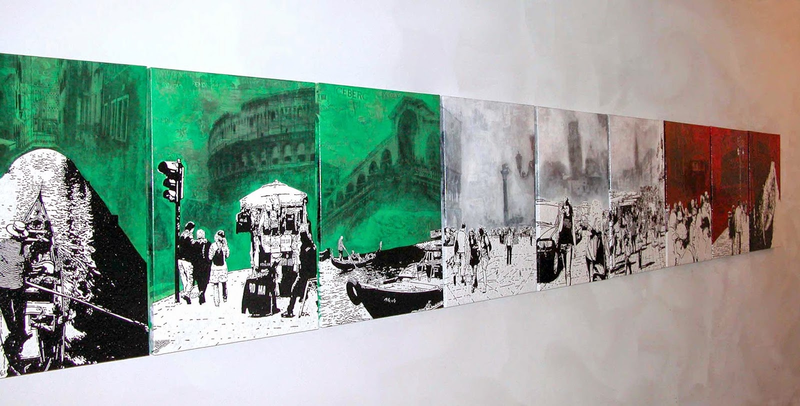 The artist Stefano Fioresi lives and works in Modena, Italy. He has shown his work in Rome, Florence and other cities in Italy. He also has had solo shows in France and Spain and several books have been published featuring his art. From Fallbrook he travels to New York where his work now appears at the National Academy Museum. Here, he shows three sets of three multimedia montages entitled “Made in Italy”. These multilayered artworks start from photographic appropriations and bring to the senses the famous Italian cityscapes and products in a colorfully striking and unique style.