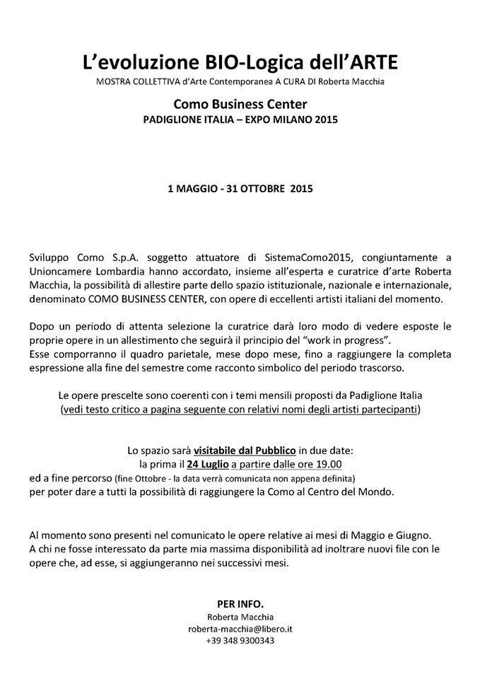 Lo spazio istituzionale Como Business Center al Padiglione Italia dell’Expo di Milano 2015 propone per tutta la durata dell’esposizione universale, dal 1° maggio al 31 ottobre, la mostra collettiva d’arte contemporanea “L’evoluzione Bio-logica dell’arte”, a cura di Roberta Macchia.