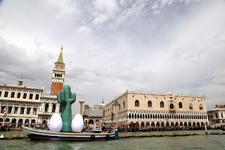All'inaugurazione della 56esima Esposizione Internazionale d’Arte di Venezia, Gufram non è passato certo inosservato. L'irriverente brand italiano di arredamento era presente a modo suo con un enorme cactus verde alto 6 metri e mezzo attorniato da due uova di un paio di metri, che ha sfilato stamane per i canali della Serenissima a bordo di una piccola imbarcazione.