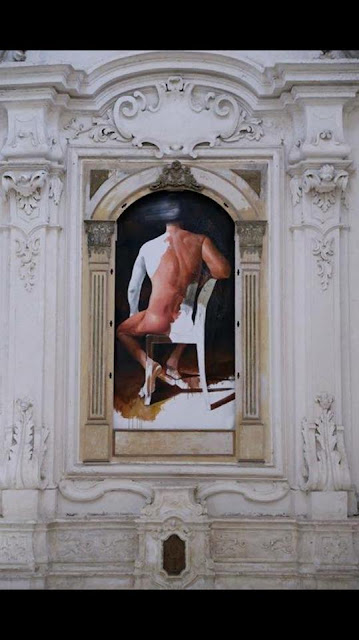 La contaminazione reciproca, che apporta conoscenza e messa in valore tanto dell’architettura chiesastica e dei suoi arredi sacri quanto della creatività e dell’estetica d’oggi, trova conferma nelle soluzioni proposte dall’artista pugliese che afferma : “ il mio progetto site specific, indaga soprattutto sulle antiche origini del luogo, in cui sono allestite le mie tre pale d’altare. La chiesa barocca nel centro storico di Brindisi e il complesso conventuale dei padri delle Scuole Pie mi hanno suggerito una narrazione figurativa dalle forti suggestioni storiche e storico-artistiche. La missione dei padri scolopi è stata sin dal 1664 quella di educare e alfabetizzare la popolazione avviando la formazione scolastica dei più piccini per poi, un decennio dopo, istituire l’Accademia degli Erranti. Dunque ho ideato tre grandi dipinti, sino a tre metri d’altezza, che parlano, raccontano, mettono in rapporto quella sede dell’istruzione e anche le sue sei e settecentesche pitture dal fondo pedagogico e l’attuale sistema scolastico nel quale opero quotidianamente”.