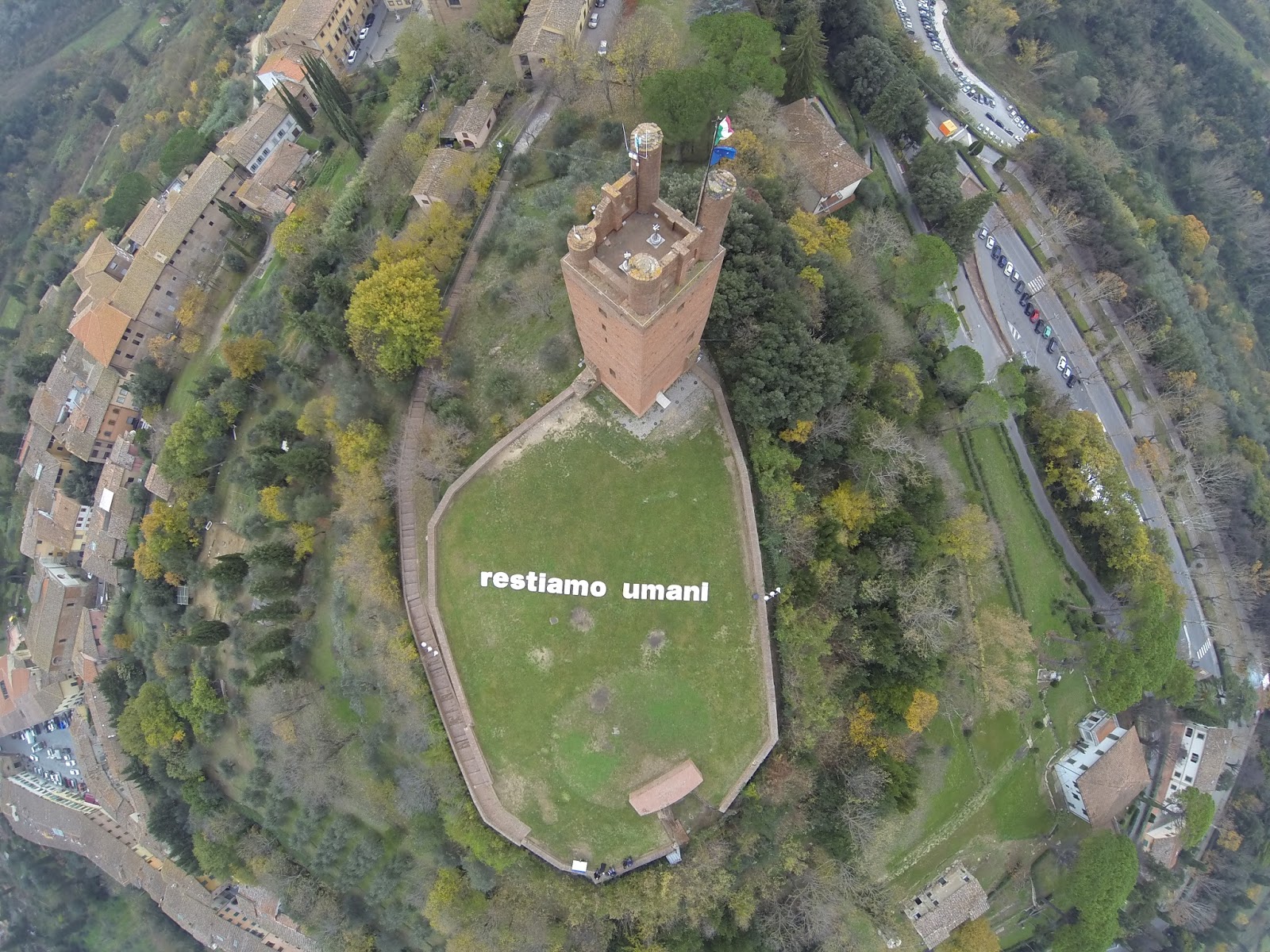 L'installazione è stata fotografata da un drone, per cogliere il messaggio nella sua dimensione urbana e restituirlo contestualizzato, in modo da aggiungere tasselli alla storia che, anche San Miniato sta contribuendo a costruire.