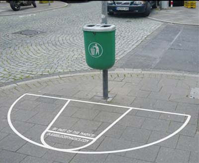 Per pubblicizzare la squadra di basket di Dusseldorf, nei cestini del centro si è ricorso ad una particolare segnaletica stradale! Fuori area "pedonale" vale tre punti! Io uscirei di casa pur di andare a buttare la carta li! :)