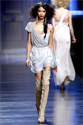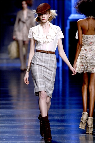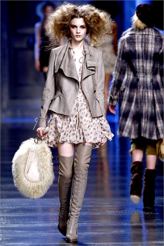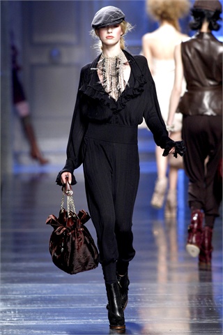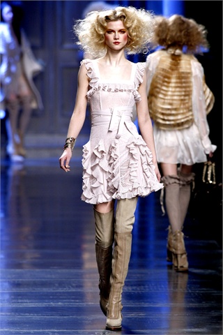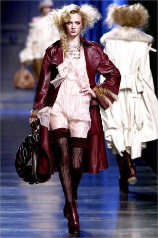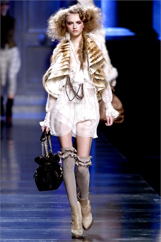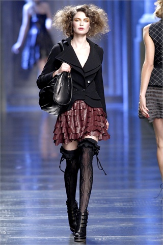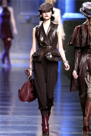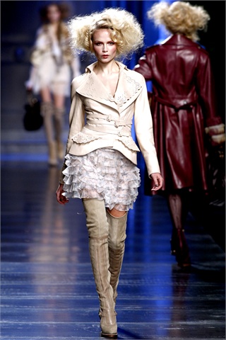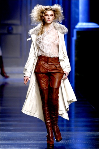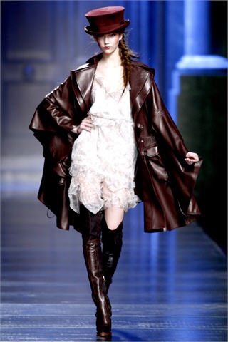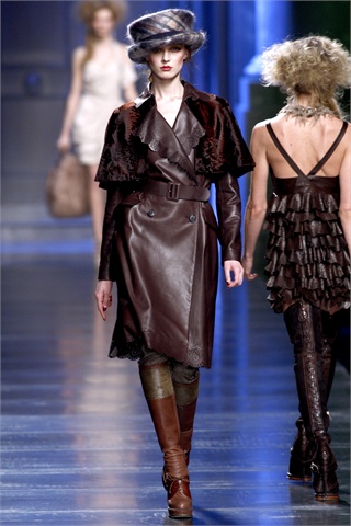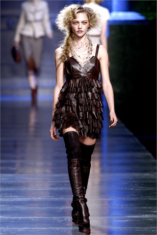 Questa è una collezzione che amo, trovo ogni abito puro e femminile, chiffon e ruche di pizzo degli abiti romantici entrano in contrasto con le pelli degli stivali e del redingote in cuoio, è sensualità ed estrosità.