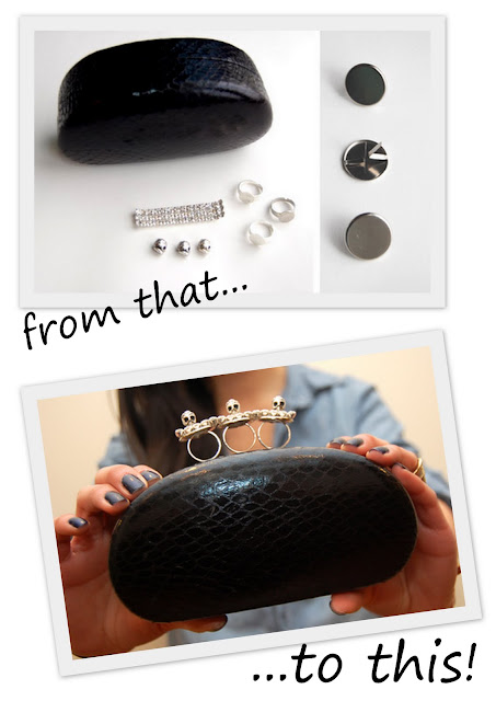Studs and Pearls is a blog where you can find plenty of ideas for DIY fashion. Such as this skull cluth à la McQueen madefrom a case for glasses!