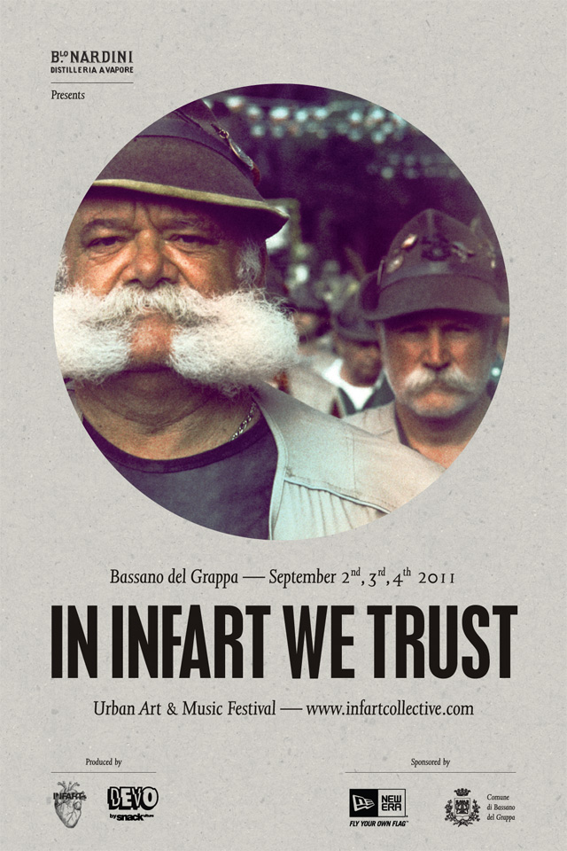 INFART 2011 FESTIVAL - IN INFART WE TRUST Autore Mer, 20/07/2011 - 23:00 | Dario Ujetto Another great Urban Art Festival in Italy. INFART COLLECTIVE promotes INFART 2011 FESTIVAL at Bassano del Grappa, Italy. An innovative concept with 60 artists and live performances, outdoor installations and so on ... The Festival program HERE.