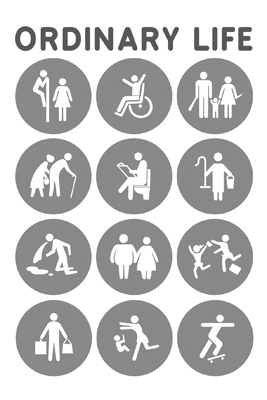 Sono microcosmi collegati da cavi nei quali, su piccoli display, si possono spiare momenti di vita quotidiana vissuti da pittogrammi segnaletici animati: i sintetici omini neri dalla testina tonda e dal corpo ridotto a poche linee si incontrano al supermercato, in coda alla cassa o intenti a spingere un carrello, ai giardinetti con i bambini, oppure, invecchiati, a passeggio per la città. Ma li si può anche ritrovare in situazioni “di ordinaria follia”, come l’omino che, dopo aver gettato ordinatamente i rifiuti nel cestino, decide – in un raptus di vandalismo – di dargli fuoco.