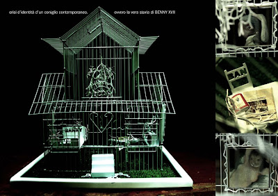 Sono due installazioni che evocano, appunto, sia il bisogno di poter ritrovare aree di silenzio in cui il tempo possa, almeno, rallentare, sia la necessità di fuga dalla distorsione dell’esistenza per rintracciare un’identità perduta. Il nido è un pezzo cui sono particolarmente affezionata, poiché è stato il primo che mi ha permesso di sperimentare l’annullamento dei confini tra opera e utilizzatore: in esso ci si può entrare, accovacciare, sdraiare. È uno spazio intimo per eccellenza, dove si possono trovare rassicurazioni: non è chiuso completamente perché la possibilità di prendere il volo deve essere sempre presente. Non una forma, ma un luogo da vivere anche fisicamente. La casetta di Benny il coniglio è, invece, una microinstallazione molto ironica da vivere con gli occhi e con la testa. In essa sono presenti piccoli richiami di storia dell’arte passata (ma anche attuale come il quadro in erba che evidentemente richiama le opere di Vittorio Comi), accenni alla storia dell’uomo e della sua cultura. Benny è l’assente, quello che resta è la testimonianza di ciò che egli potrebbe essere: ognuno interpreta secondo la personale perizia. La casa, l’ambiente domestico in realtà è una gabbia da cui Benny è fuggito alla ricerca della sua naturale identità. I richiami di facile riconducibilità invitano lo spettatore a curiosare, a leggere, a immaginare: sono indizi necessari a risolvere un enigma. Un modo differente di rompere i confini tra fruitore e opera: ancora una volta non solo forma ma uno spazio da vivere, in questo caso, mentalmente.