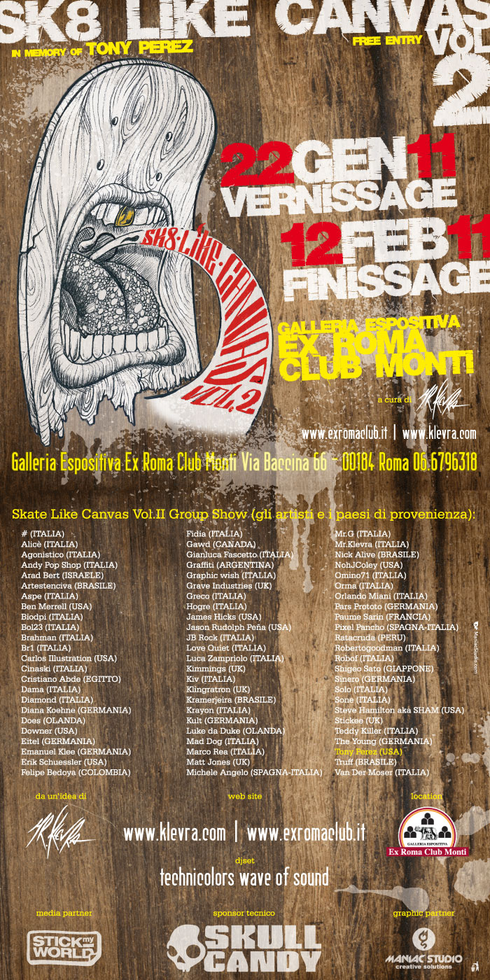 The project began in 2008 on the pages of the social network Flickr, which saw the collection of more than 700 images of custom skateboards from every corner of the planet. From this group, sixty-plus artists were invited to submit original works that will travel Italy for expos and events held under the name "SK8 LIKE CANVAS" and that will open 2011 with an exclusive exhibition at the Gallery Club Ex Rome Monti in Rome. During the opening night scheduled for Saturday, January 22, 2011, a selection of artists will perform in a collective performance of live painting, customizing a few skateboards to be added to the works already selected and displayed during the exhibit.