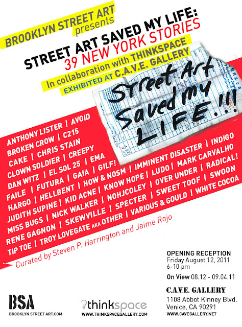 Brooklyn Street Art Presents Street Art Saved My Life : 39 New York Stories in collaboration with ThinkSpace Gallery, an art show to exhibit at C.A.V.E. Gallery in Venice (LA), California on Friday, August 12, 2011.